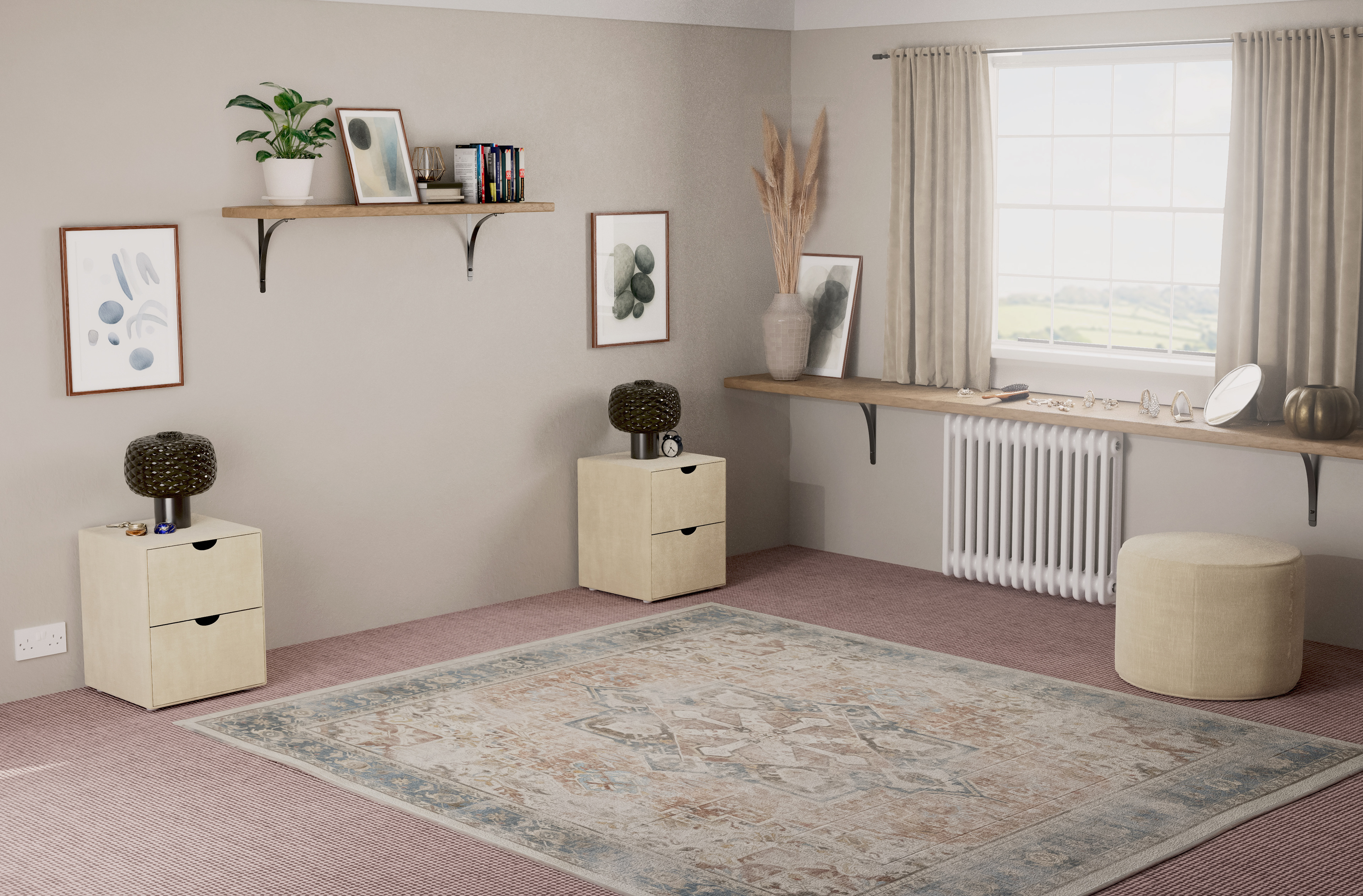 Original photograph taken with white background. Image adjusted for tone and colour. CGI room created using focal length information from camera lens. Both images then composited in Photoshop. Shadows added, further tone and retouching to match room set.